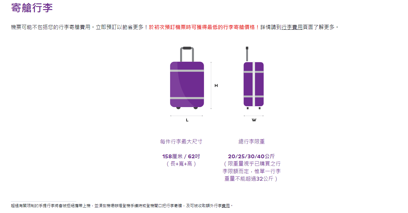 每件行李限重20/32公斤(限重量視乎已購買之行李限額而定)