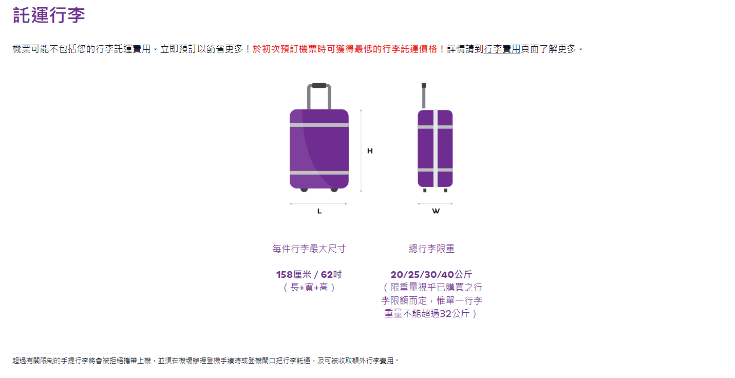 每件行李限重20/32公斤(限重量視乎已購買之行李限額而定)